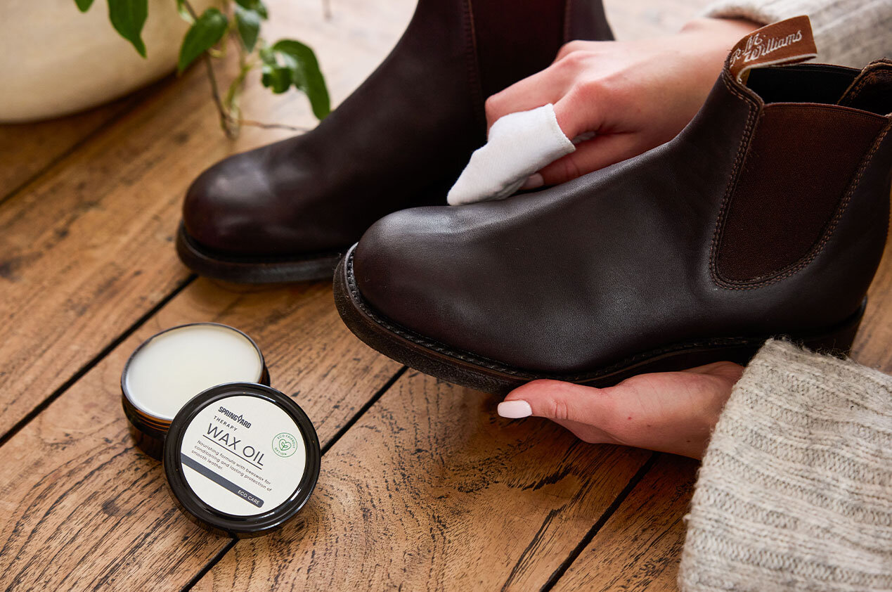 För att hålla skorna fina längre, använd den skovård som är anpassad efter materialet. Har du kängor i skinn ska du applicera ett tunt, jämnt lager skovax för att ge lädret näring och lyster. Använd cirkulerande rörelser och låt sedan vaxet torka i cirka 10 minuter. Avsluta med att noggrant borsta skon med en skoborste för att arbeta in krämen och ge ytan en fin glans. Är dina kängor i mocka? Då ska du i stället lägga på ett tunt och jämnt lager mockalotion, colour restore, för att återställa färg och lyster till materialet. Välj en lotion som är neutral, eller en som matchar skons färg.